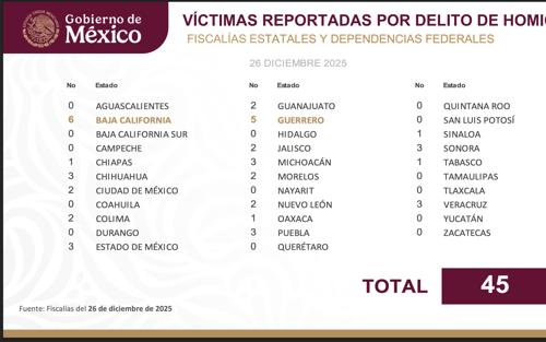 A nivel nacional, México contabilizó 45 homicidios en total, con Baja California y Guerrero como las entidades con el mayor número de casos. En Chihuahua, uno de los hechos ocurrió en Riberas de Sacramento, donde un hombre fue ejecutado a balazos afuera de su domicilio.