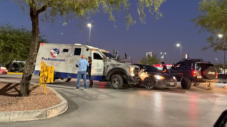 Un accidente de tránsito se registró la tarde de este jueves en la entrada del estacionamiento de Costco, donde un camión de valores chocó contra un vehículo particular que intentaba salir del lugar.