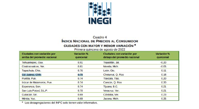 Publicó el Inegi los datos de inflación en la primera quincena de agosto del 2022 y Ciudad Juárez fue el cuarto lugar a nivel nacional donde detectaron mayor alza de precios.