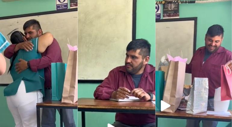 En la grabación compartida en dicha red social se puede ver cómo los alumnos sorprenden al docente y le entregan obsequios para ayudarlo, lo que hizo que el maestro se conmoviera.