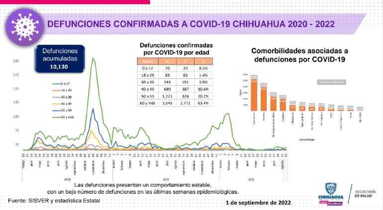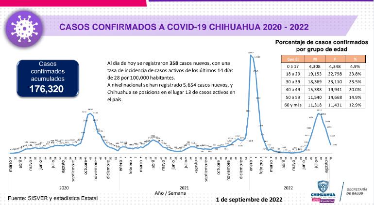 La Secretaría de Salud de Chihuahua actualizó su reporte de COVID-19 este 1 de septiembre como acostumbra los jueves, con otros 358 casos más que el informe hace dos días, para un saldo semanal de 1 mil 032.