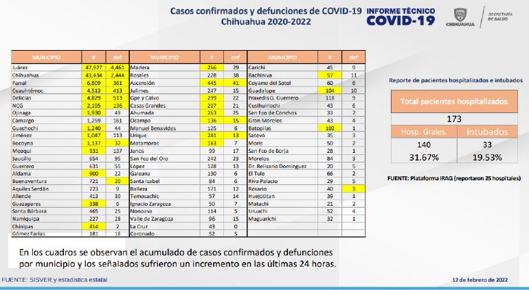 Juárez (+197), Chihuahua (+416), Parral (+33), Cuauhtémoc (+22), Delicias (+6), Nuevo Casas Grandes (+9), Ojinaga (+4), Guachochi (+1), Jiménez (+1), Bocoyna (+1), Meoqui (+4), Aldama (+3), Guazapares (+1), Chínipas (+1), Madera (+2), Ascensión (+1), Guadalupe y Calvo (+1), Casas Grandes (+3), Ahumada (+7), Ocampo (+1), Urique (+1), Matamoros (+1), Bachíniva (+1), Guadalupe (+1) y Batopilas (+2).