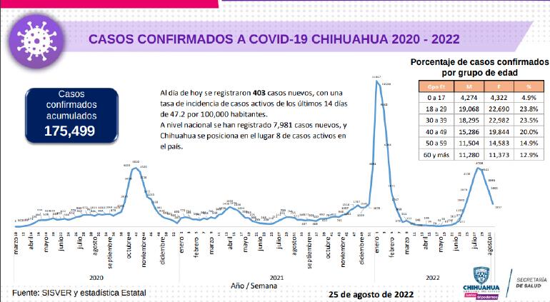 El estado de Chihuahua continúa a la baja y en el último reporte confirmaron sólo 403 contagios, aunque perdieron la vida otras dos personas, informó la Secretaría de Salud este 25 de agosto del 2022.