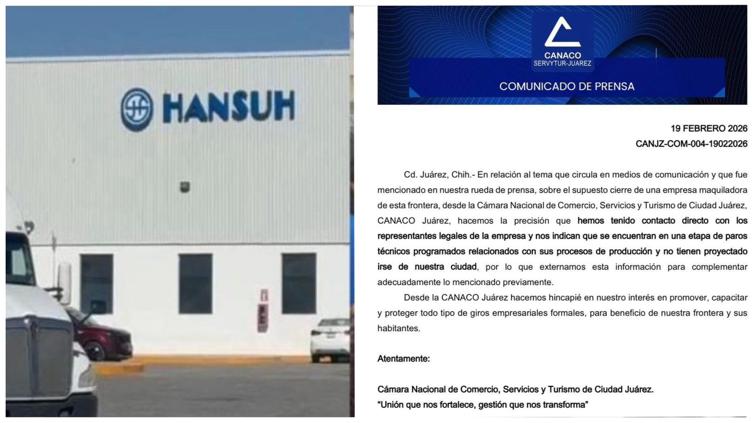 Luego de que circulara en medios la versión de que la maquiladora Hansuh dejaría de operar en Ciudad Juárez, la Cámara Nacional de Comercio, Servicios y Turismo de Ciudad Juárez (CANACO Juárez) aclaró que la empresa no tiene planes de cerrar ni de irse de la ciudad.
