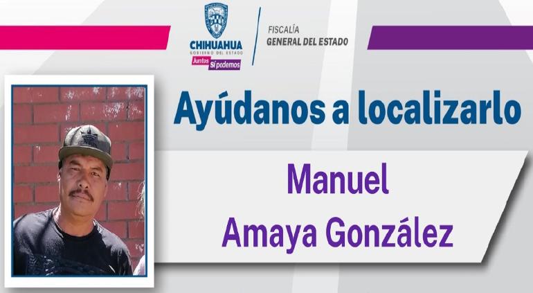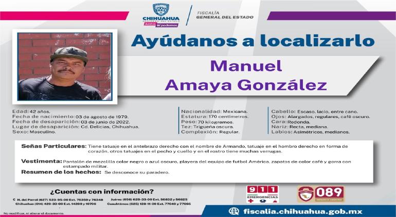 Manuel Amaya González de 42 años fue visto por última vez el tres de junio del presente año en Delicias, Chihuahua. La familia y la fiscalía solicitan ayuda para encontrarlo ya que desconocen su paradero.