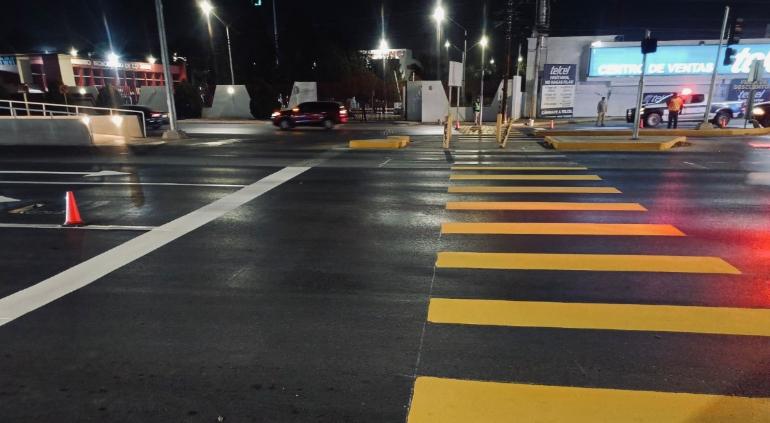 De manera complementaria, durante trabajos efectuados en horario nocturno, se intervino el cruce de la avenida Tecnológico y Simona Barba, donde se pintaron pasos peatonales, líneas de frenado y flechas de circulación, además de instalar estoperoles.