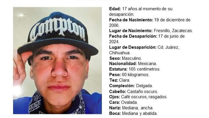 La Fiscalía General del Estado de Chihuahua, a través de la Comisión Local de Búsqueda, ha emitido una alerta oficial para localizar a Carlos Iván Cervantes Sierra, un joven de 17 años que desapareció en esta ciudad fronteriza el pasado 17 de junio de 2024.
