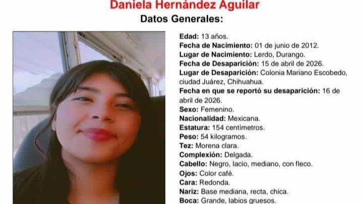 Las autoridades del estado de Chihuahua han emitido una ficha de búsqueda oficial tras la desaparición de Daniela Hernández Aguilar, una menor de 13 años de edad, de quien se desconoce su paradero desde el pasado miércoles 15 de abril de 2026.