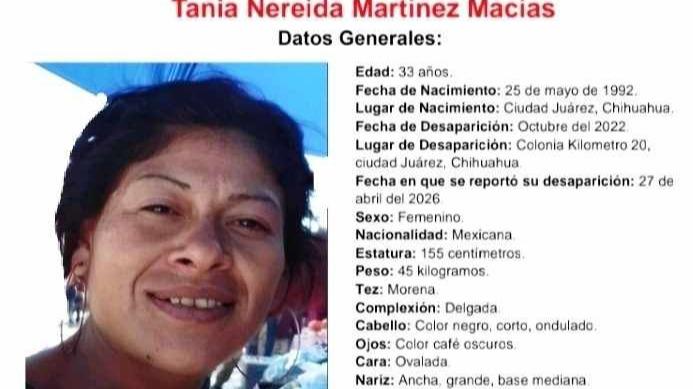 La Fiscalía General del Estado de Chihuahua, a través de la Fiscalía Especializada en Atención a Mujeres Víctimas del Delito por Razones de Género y a la Familia, ha emitido una ficha de búsqueda oficial para localizar a Tania Nereida Martínez Macías, de 33 años de edad.
