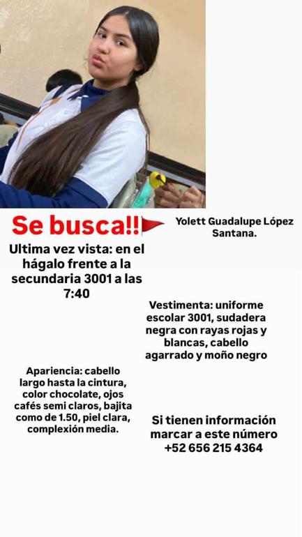 De acuerdo con el resumen de los hechos, Yolett Guadalupe desapareció en la Zona Centro de esta ciudad, específicamente frente a la Secundaria Estatal No. 3001. Desde ese momento, familiares y amigos desconocen su paradero, por lo que se ha solicitado el apoyo de la ciudadanía para localizarla.