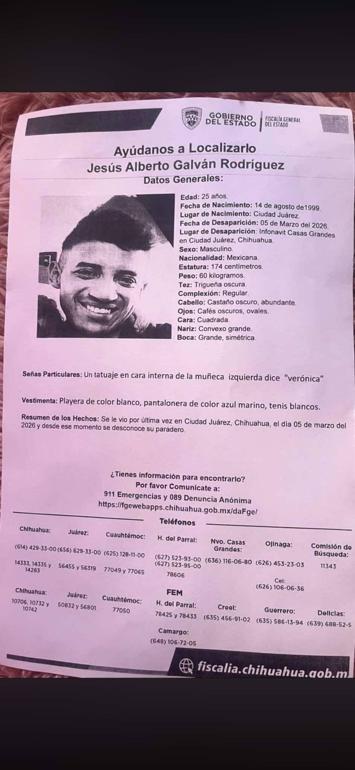 La Fiscalía General del Estado de Chihuahua ha emitido una ficha de búsqueda oficial para localizar a Jesús Alberto Galván Rodríguez, de 25 años de edad, quien fue visto por última vez el pasado 5 de marzo de 2026.