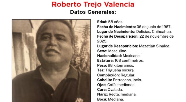 Solicitan ayuda para dar con el paradero de Roberto Trejo Valencia quien desapareció hace cinco días en Mazatlán, Sinaloa.
