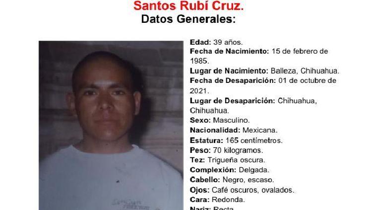 El ciudadano Santos Rubí Cruz, de 39 años de edad, fue visto por última vez el 21 de octubre de 2021, en el kilómetro nueve de la carretera Chihuahua a Aldama.