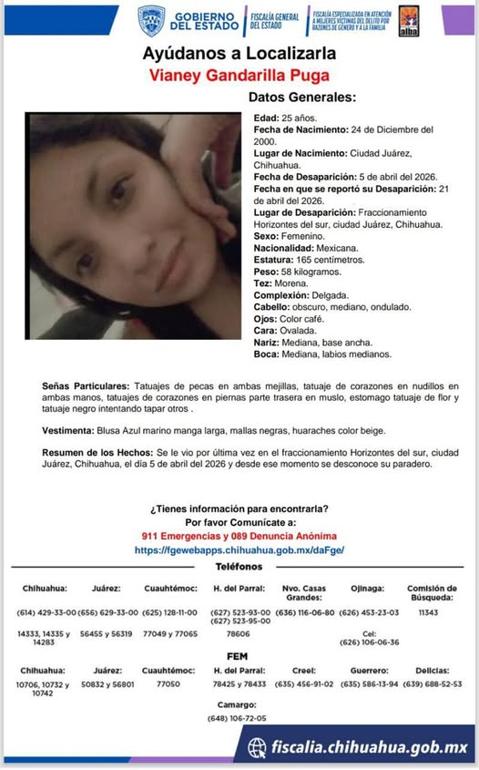 La Fiscalía General del Estado de Chihuahua, a través de la Fiscalía Especializada en Atención a Mujeres Víctimas del Delito por Razones de Género y a la Familia, ha emitido una alerta oficial para localizar a Vianey Gandarilla Puga, de 25 años de edad, quien fue vista por última vez hace poco más de dos semanas en esta ciudad.