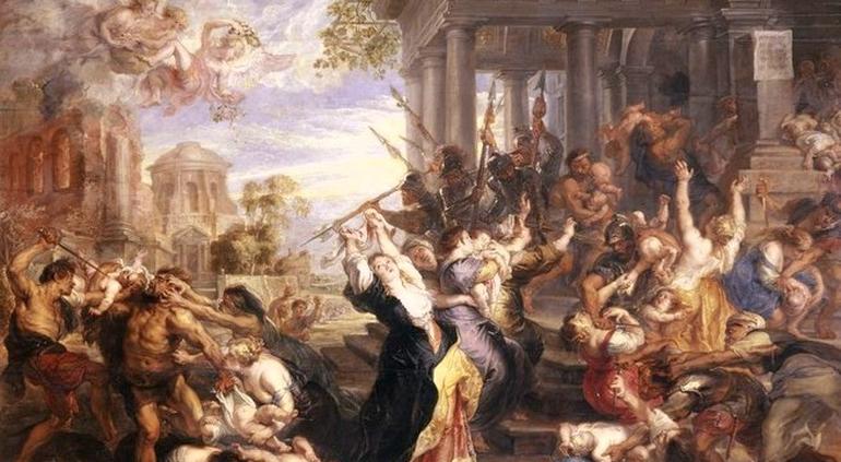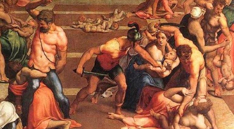 Herodes envió a un grupo de soldados a Belén con la orden de asesinar a todos los niños menores de dos años que encontraron, para asegurarse de que muriera el futuro Rey de Israel, esperado por el pueblo judío, como lo anunciaban los profetas.