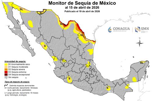 Para el 15 de abril, el 87.7% del territorio del país estaba sin afectación, 8.0% estaba anormalmente seco (D0), 2.4% estaba en sequía moderada (D1), 1.2% en sequía severa (D2), 0.6% sequía extrema (D3) y 0.1% sequía excepcional (D4).