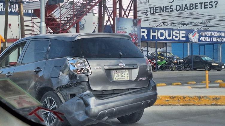 Un accidente de tránsito se registró en la avenida Gómez Morín, a la altura del cruce con la calle Faraday, luego de que una camioneta Toyota gris diera una vuelta prohibida e impactara a un camión del JuárezBus