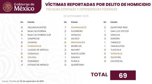Colima reportó nueve homicidios, Guajanuato; siete, Michoacán; seis (igual que Chihuahua) y Veracruz; cinco.