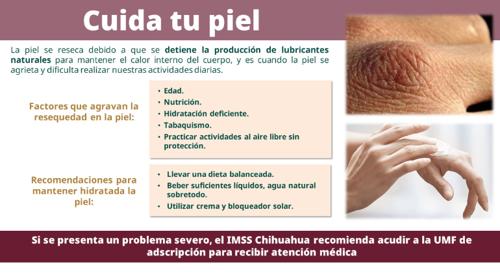 El Instituto Mexicano del Seguro Social (IMSS) en Chihuahua, recomienda mantener precaución ante el frío, ya que éste puede causar resequedad en la piel, lo que ocasiona pequeñas lesiones superficiales que suelen ser dolorosas y molestas.