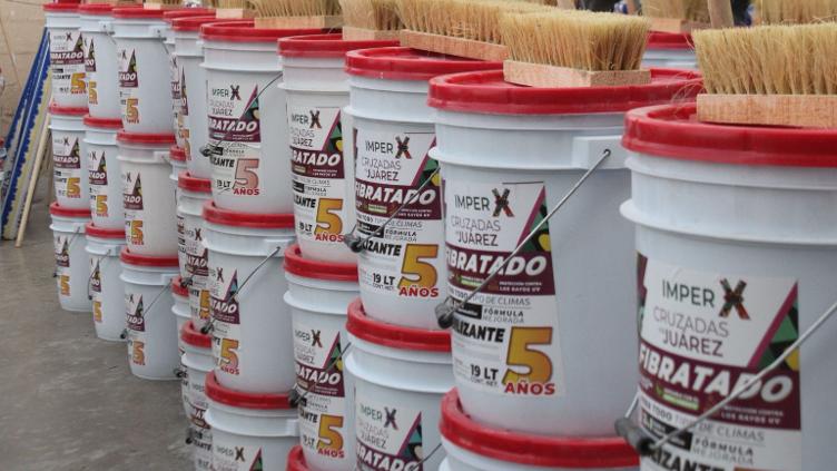 Cada paquete contiene tres cubetas de impermeabilizante, además de malla y cepillo, lo necesario para que las familias puedan aplicar el producto en sus techos y evitar goteras, con una protección que puede durar hasta cinco años.