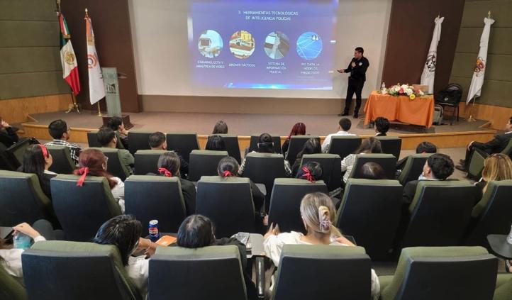 El oficial Alfredo Velazco, encargado del Área de Investigación de la Secretaría de Seguridad Pública Municipal, impartió una conferencia dirigida a estudiantes de criminología de la Universidad Vizcaya Ciudad Juárez, con el objetivo de impulsar la profesionalización de los cuerpos de seguridad.