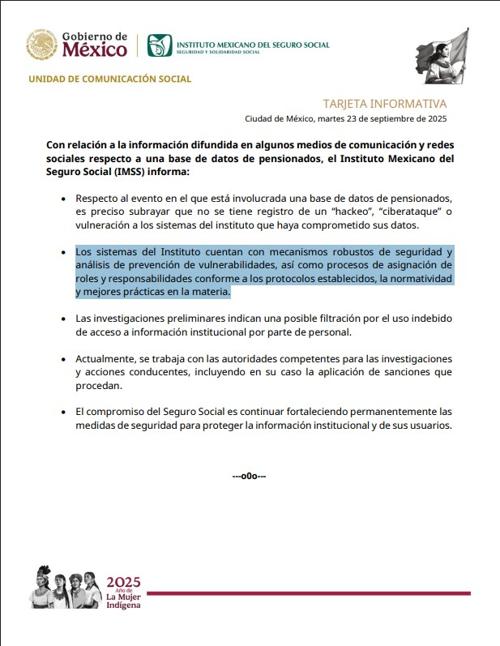 Emitió tarjeta informativa el IMSS donde asegura que no tiene registro de un hackeo o ciberataque u otra clase de vulneración a sus sistemas, pues cuentan con “mecanismos robustos”.