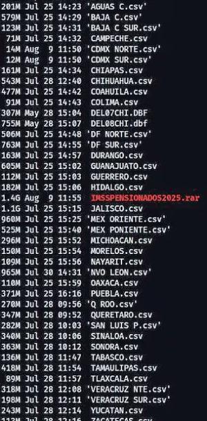 Entre los archivos puede verse que están repartidos en tablas de formato básico .csv (parecido al formato de Excel), incluyendo de los pensionados de Chihuahua con corte al 28 de julio y de otros estados con fechas similares.