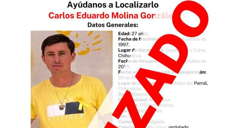 Carlos Eduardo M.G., de 27 años de edad, fue reportado como desaparecido en Parral, Chihuahua; sin embargo, la Fiscalía General del Estado logró ubicarlo sano y salvo. Estaba con amigos y quedó sin batería su celular, por lo que ya no pudo comunicarse con sus padres.