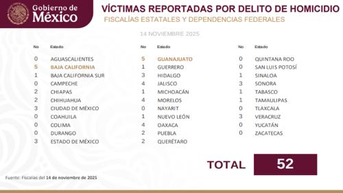 Publicó la Comisión Nacional de Seguridad (CNS) el reporte diario de homicidios dolosos del 14 de noviembre con un total de 52 casos en todo el país.