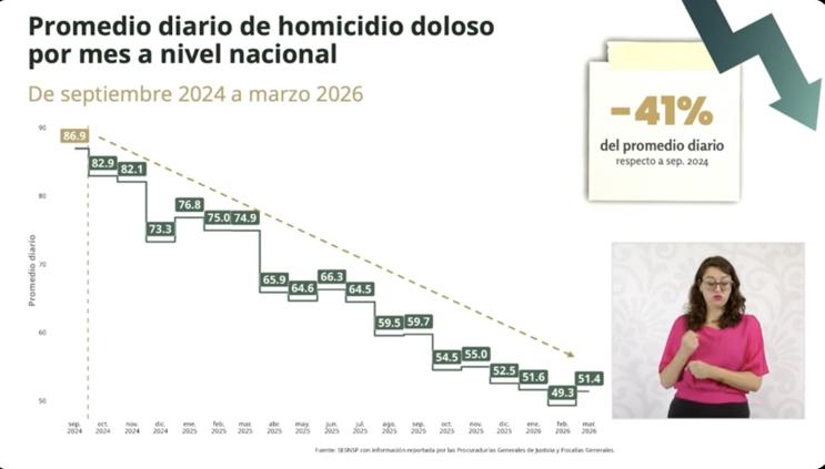 Marcela Figueroa Franco, titular del Secretariado Ejecutivo del Sistema Nacional de Seguridad Pública, informó que el promedio diario de homicidios dolosos en México registró una reducción del 41% entre septiembre de 2024 y marzo de 2026, al pasar de 86.9 a 51.4 casos diarios, lo que equivale a 35 asesinatos menos por día.