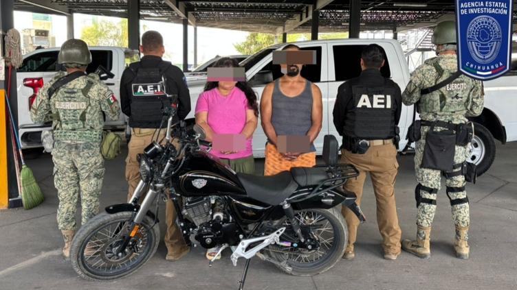La mencionada pareja iba a bordo de una motocicleta Vento, color negro, modelo 2023, la cual resultó con reporte de robo interpuesto el día 07 de septiembre de 2025.