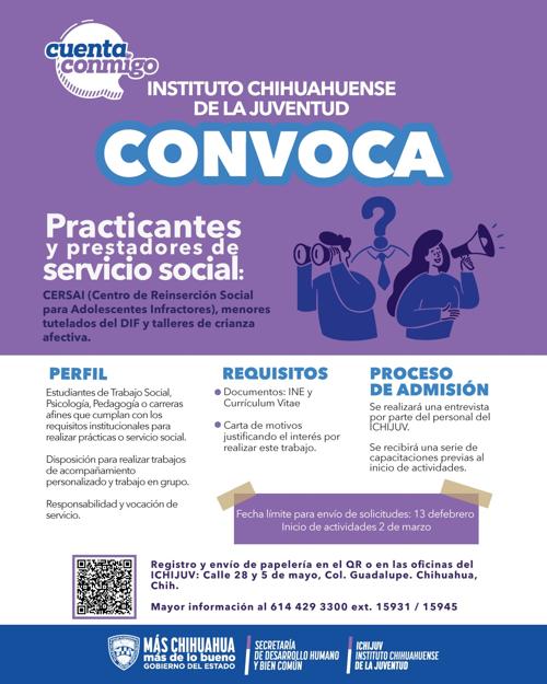 El Instituto Chihuahuense de la Juventud (Ichijuv) convocó a estudiantes de psicología, pedagogía, trabajo social y carreras afines para liberar servicio social o hacer prácticas profesionales con el DIF o el Cersai.