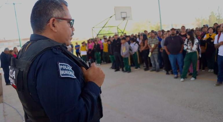 Elementos de la Policía Municipal visitaron la secundaria estatal 3082, en el Kilómetro 20, para ofrecer una plática preventiva dirigida a estudiantes, padres de familia y docentes.