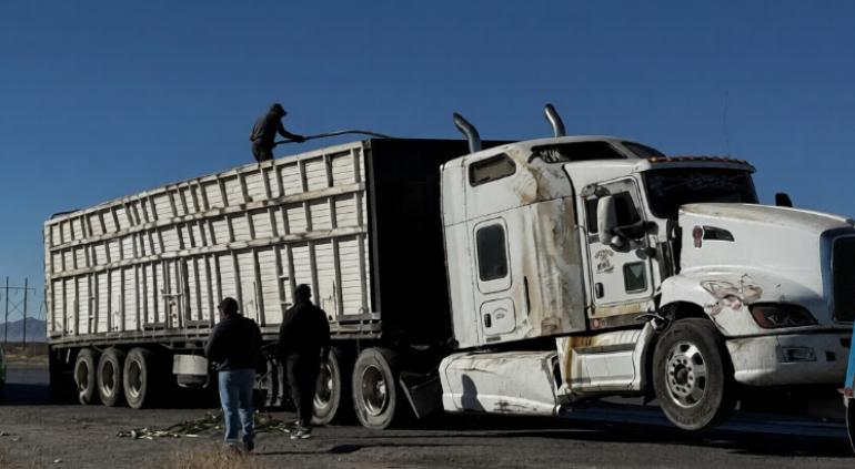 Un camión de carga terminó volcado en el kilómetro 330 de la carretera Panamericana, cuando se dirigía rumbo Ciudad Juárez con destino a la Central de Abastos.