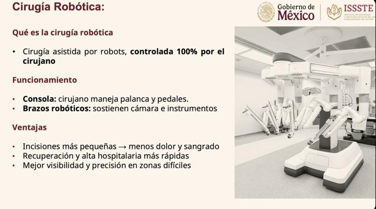 El ISSSTE anunció que a partir del 24 de septiembre iniciará la operación de robots quirúrgicos en seis hospitales del país, como parte de un plan de modernización en cirugía robótica. El director general, Martí Batres Guadarrama, destacó que la tecnología permitirá cirugías más precisas, menos dolorosas y con una recuperación más rápida.