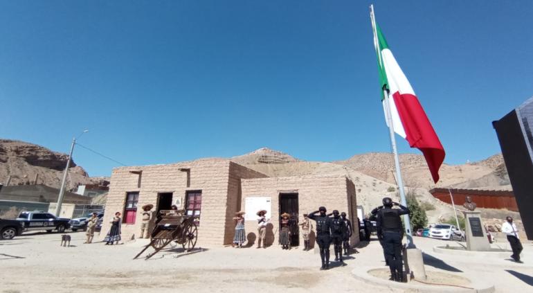 Autoridades municipales llevaron a cabo honores a la Bandera desde la Casa de Adobe, sitio que en los tiempos de la Revolución Mexicana fuera campamento maderista.