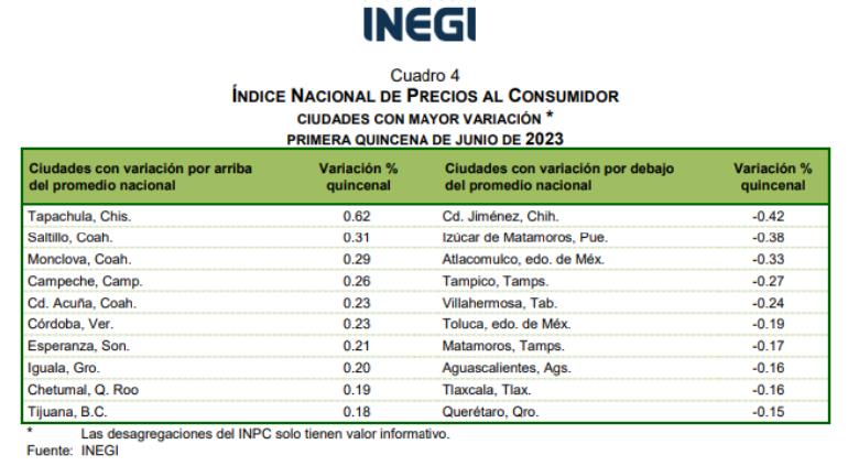 En el otro extremo, la ciudad con mayor inflación del país fue Tapachula, Chiapas, al superar el promedio por 0.62 puntos porcentuales; es decir, un dato de 5.80%.