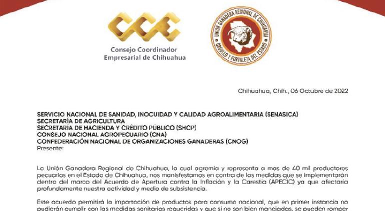 Lo anterior a través de un desplegado que hoy difundio la Unión Ganadera Regional de Chihuahua.