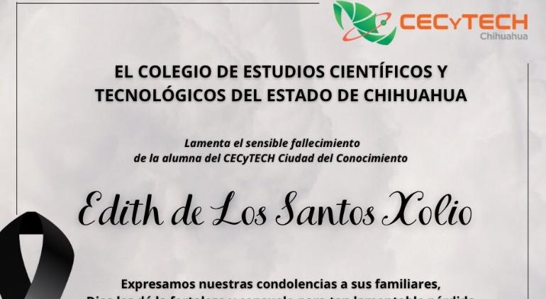“Lamentamos profundamente el fallecimiento de nuestra alumna Edith De los Santos Xolio, estudiante de sexto semestre de la carrera de Mecatrónica en el plantel Cecytech Ciudad del Conocimiento, Juárez. Su recuerdo permanecerá por siempre en los corazones de quienes tuvimos la fortuna de coincidir con ella en el camino.¡Descanse en Paz!”, expresó la institución.