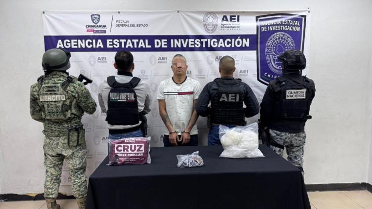 Elementos de la Agencia Estatal de Investigación detuvieron a Adrián Rafael C. R. en Ciudad Juárez por delitos contra la salud y posesión ilegal de un arma de fuego.
