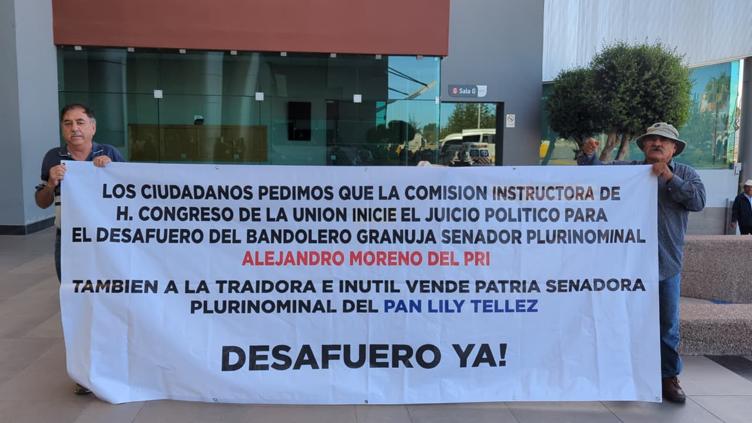 Con una lona en mano, los ciudadanos exigieron al Congreso de la Unión el desafuero de los senadores Alejandro ‘Alito’ Moreno Cárdenas, dirigente nacional del Partido Revolucionario Institucional (PRI), y de Lilly Téllez García, quien forma parte del Grupo Parlamentario del Partido Acción Nacional (PAN).