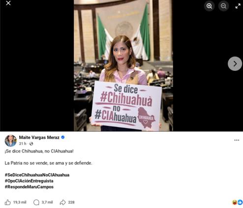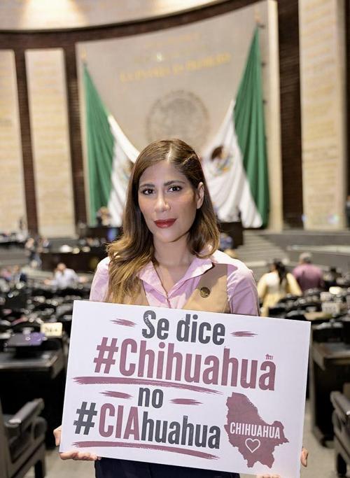 “¡Se dice Chihuahua, no CIAhuahua! La Patria no se vende, se ama y se defiende”, dijo la diputada por Morena del Distrito 2 del estado, que representa el Suroriente y Valle de Juárez, así como al municipio de Ahumada.