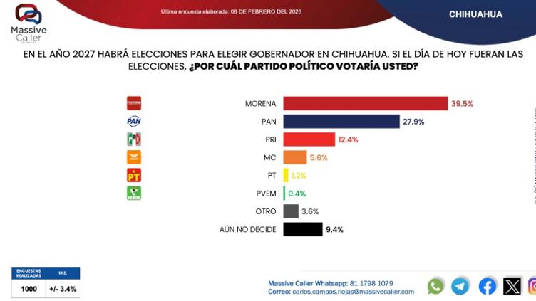 Difundió Massive Caller la encuesta levantada el viernes 6 de febrero para la gubernatura de Chihuahua, con las preferencias por partido político y los posibles candidatos dentro de cada fuerza.