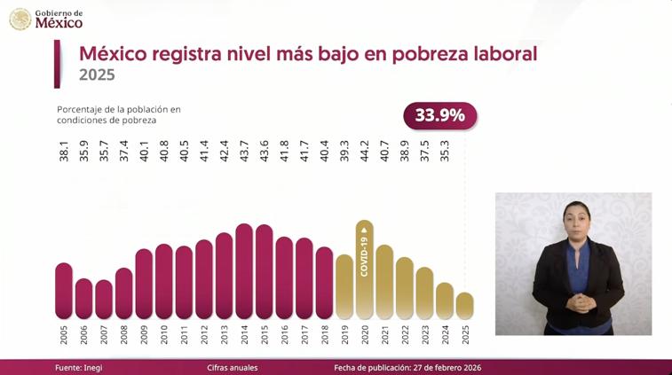 La presidenta Claudia Sheinbaum Pardo informó que México alcanzó en 2025 el nivel más bajo de pobreza laboral desde que se tiene registro, al ubicarse en 33.9 por ciento de la población, de acuerdo con datos del Instituto Nacional de Estadística y Geografía (Inegi). Explicó que este indicador mide a las personas cuyo ingreso laboral no alcanza para adquirir la canasta básica.