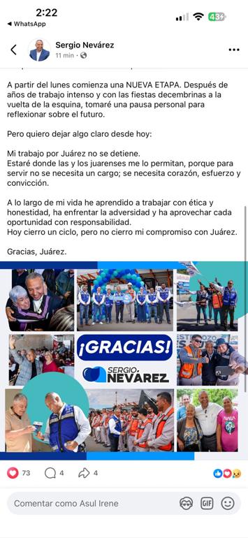 "Mi trabajo por Juárez no se detiene. Estaré en donde las y los juarenses me permitan, por que para servir no se necesita ningún cargo; se necesita corazón, esfuerzo y convicción", expresó Nevárez Rodríguez por medio de su cuenta oficial en Facebook.