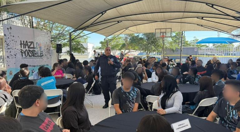 Agentes municipales invitaron a estudiantes a ser parte activa de la seguridad de su comunidad durante la conferencia “Seguridad Ciudadana: Hazlo Posible”, impartida en la Preparatoria Estatal No. 8420 y el Conalep III.