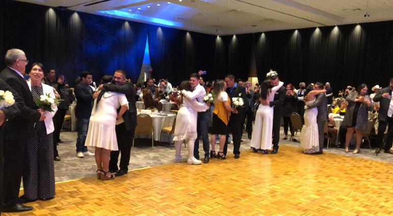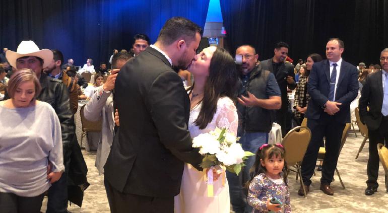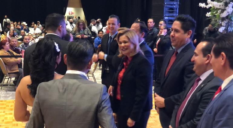 Maru Campos Galván, gobernadora del estado de Chihuahua, casó legalmente a 142 parejas de novios en las instalaciones del Centro de Convenciones, lugar donde organizaron una cena formal para los recientes esposos y sus familiares.