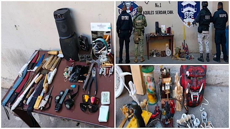 El Gabinete de Seguridad del Gobierno de México detalló que entre los objetos confiscados se encontraron figuras de la muerte y máscaras alusivas a demonios.