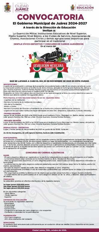 La Dirección de Educación Municipal invitó a escuelas de todos los niveles, así como a clubes, asociaciones civiles, grupos deportivos y a la Guarnición Militar, a participar en el Desfile Cívico-Deportivo y Concurso de Carros Alegóricos por el 115 aniversario de la Revolución Mexicana.