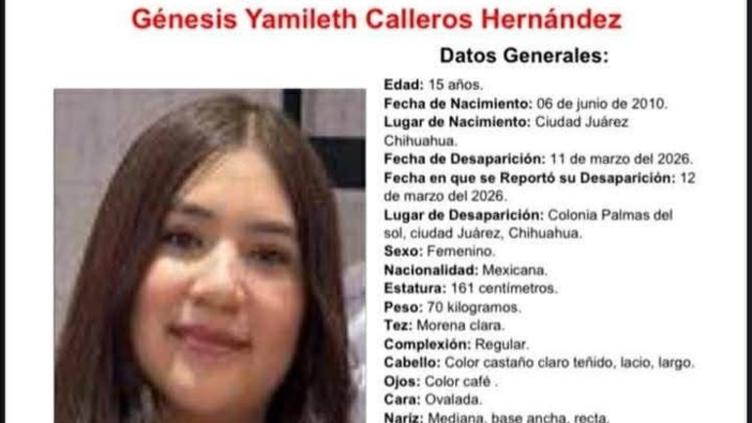 La Fiscalía pidió el apoyo de la comunidad para localizar a la adolescente Génesis Yamileth Calleros Hernández de 15 años de edad reportada como desaparecida en Ciudad Juárez.